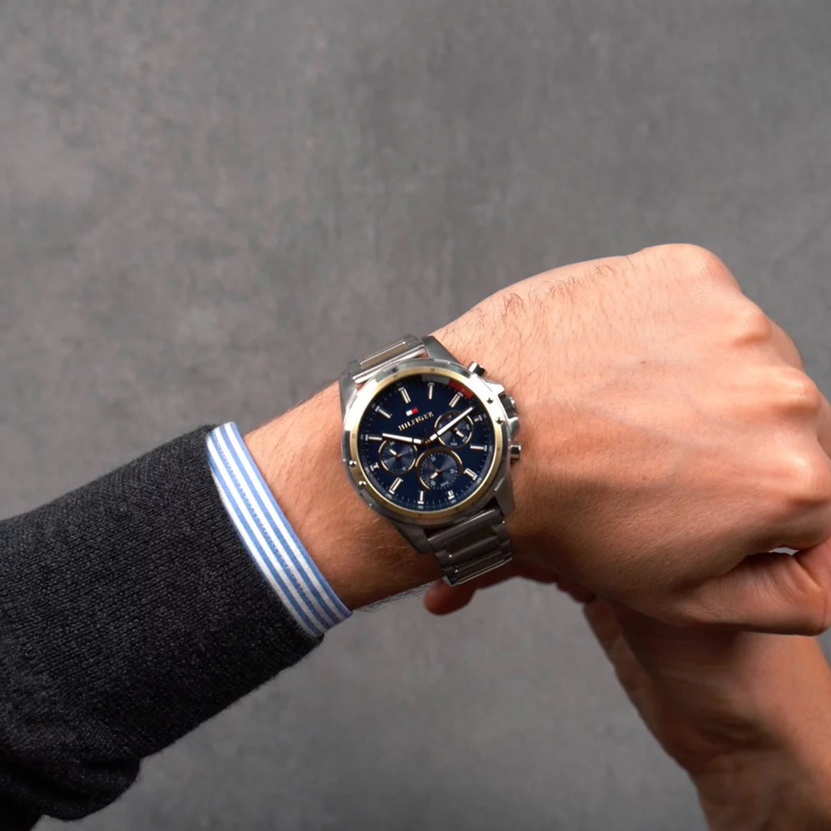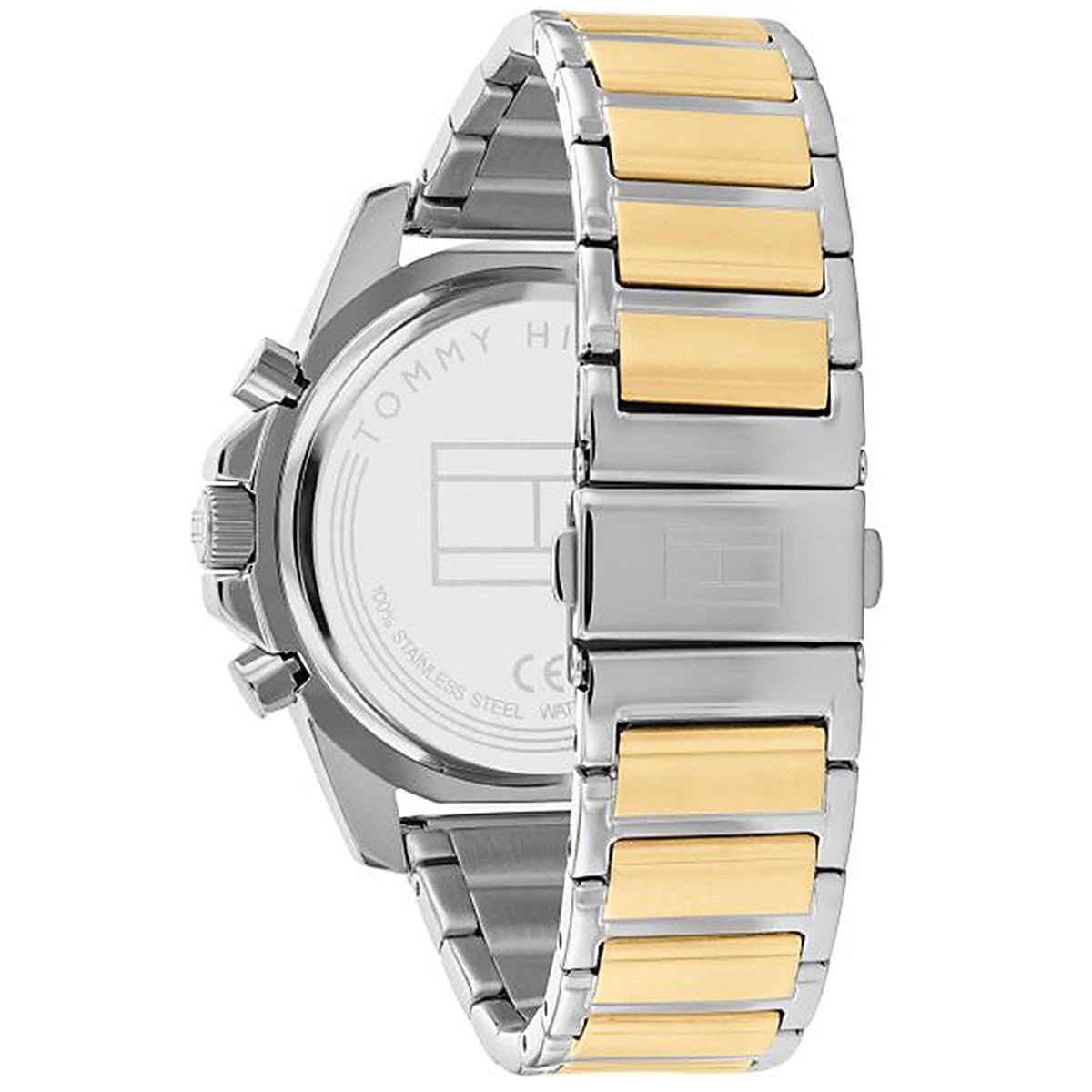 This Tommy Hilfiger watch has a stainless steel case 44mm in diameter and is fitted with a metal strap. Inside the case lies a movement and the watch features a mineral crystal. The watch is 5ATM. This means the watch is suitable for showering.