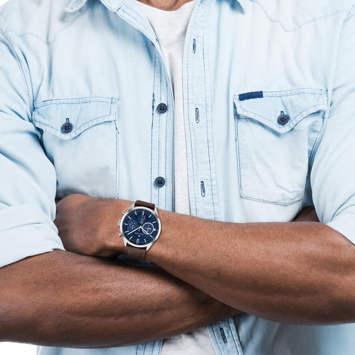 Casually elegant– detailed, bold, confident. Sunray dial with textured reflector ring and branded details throughout. Integrated link bracelets and leather straps, Multifunction movement: 44MM, 5 ATM (9H), date (6H), and weekday sub-eyes (3H).