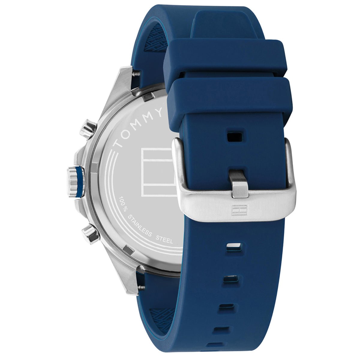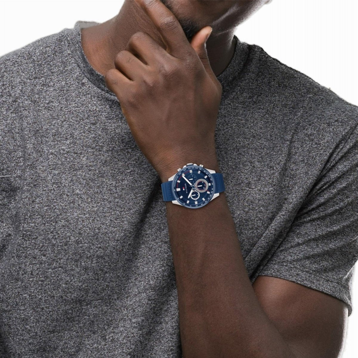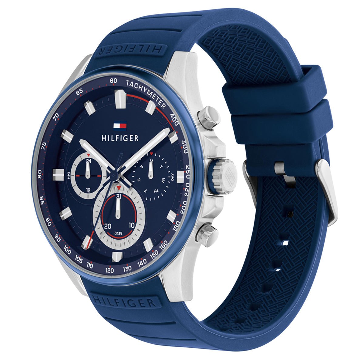 This watch is part of Tommy Hilfiger’s Max collection for men. This model features a blue dial with silver baton indices and three sub-dials. The dial exhibits silver hour and minute hands with a blue second hand. A blue tachymeter bezel frames the dial. The case of this model is made from stainless steel. It measures 45mm in diameter and 10mm in depth. finished with a blue silicone strap, This model is water-resistant up to 50 meters (5 bar).