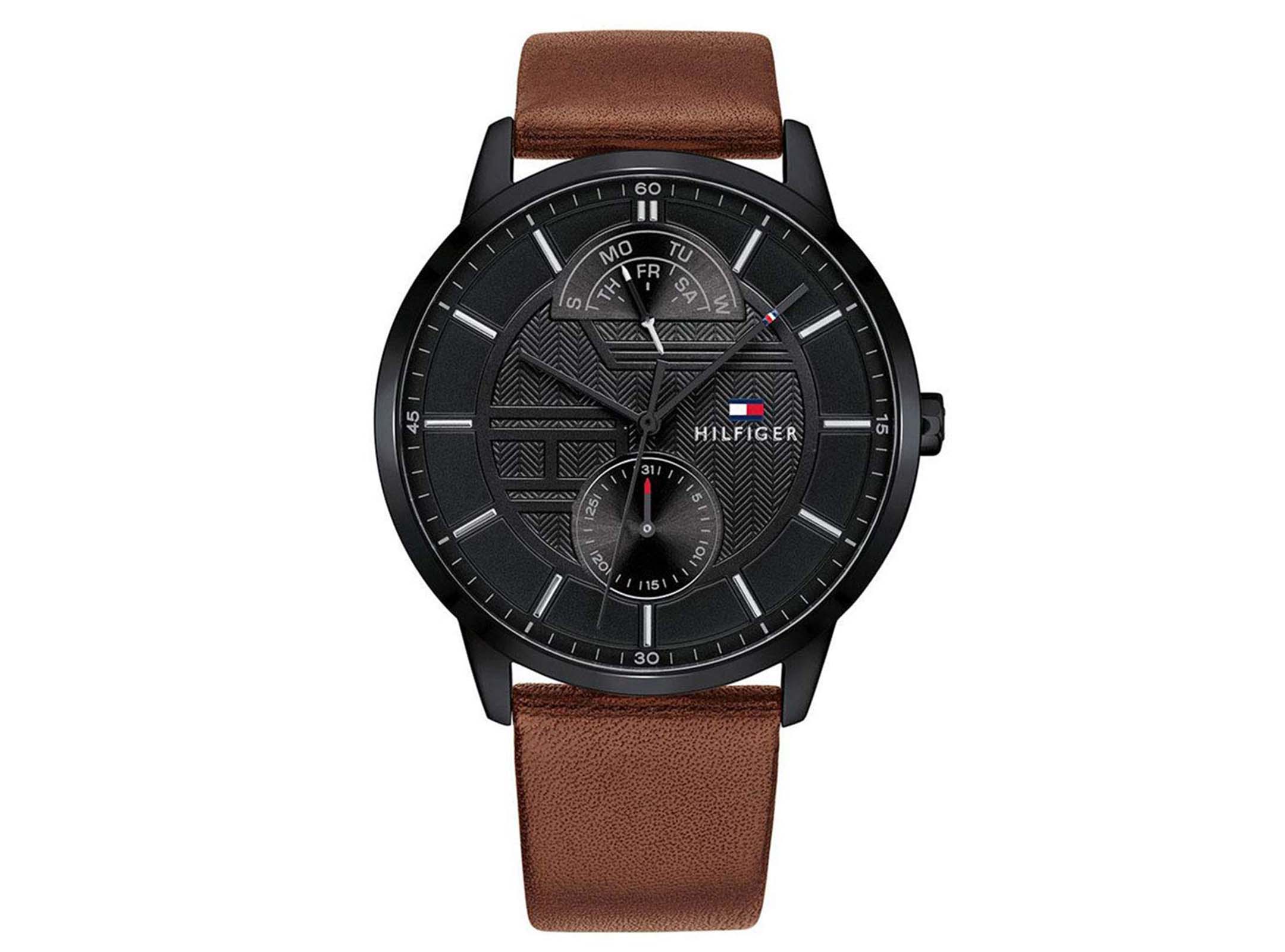 Tommy Hilfiger men’s watch. Perfect timing, indeed. Our latest timepiece features an ion-plated case and light brown leather strap with a sleek black dial. Made complete with date and time sub-dials, three-hand movement and our iconic Tommy flag.