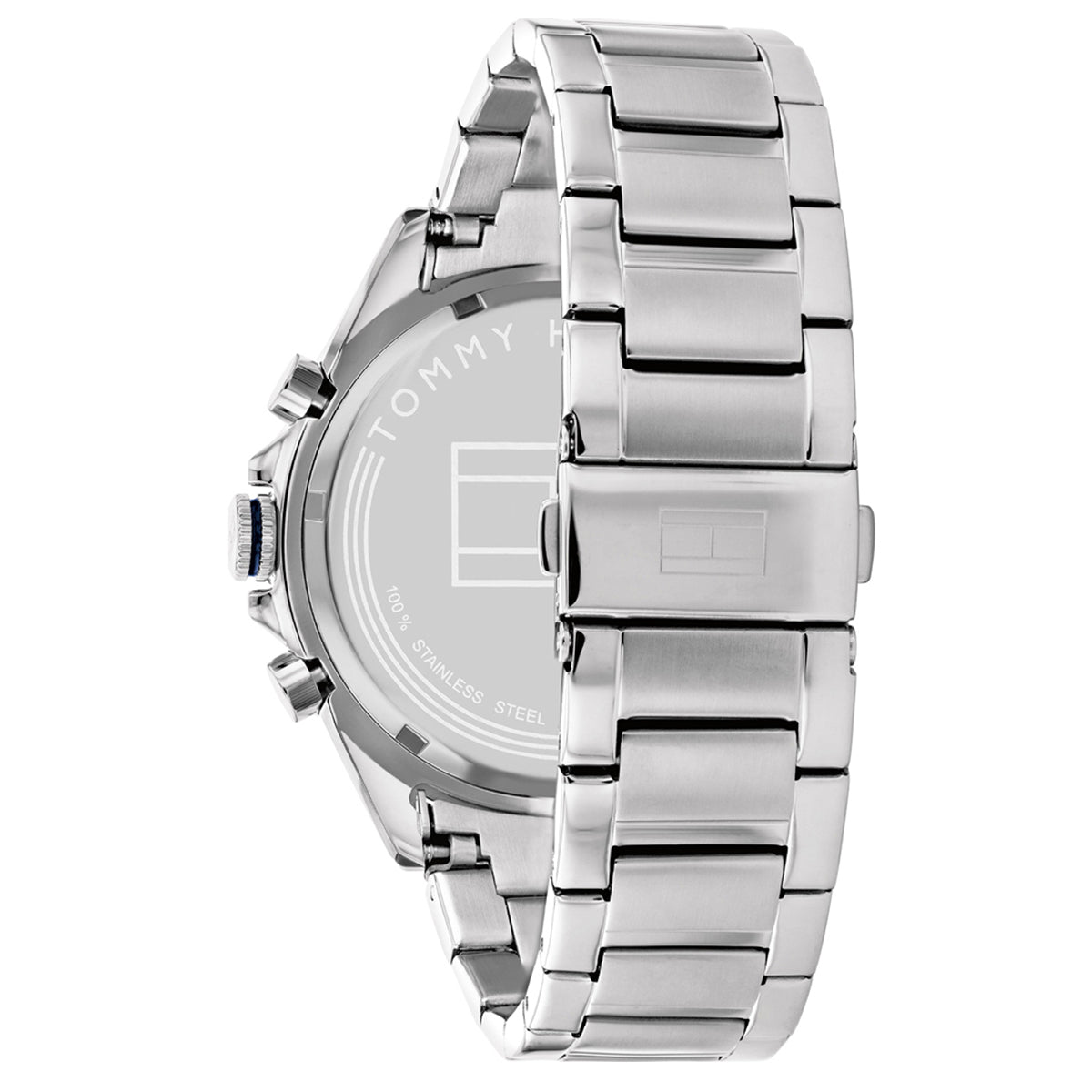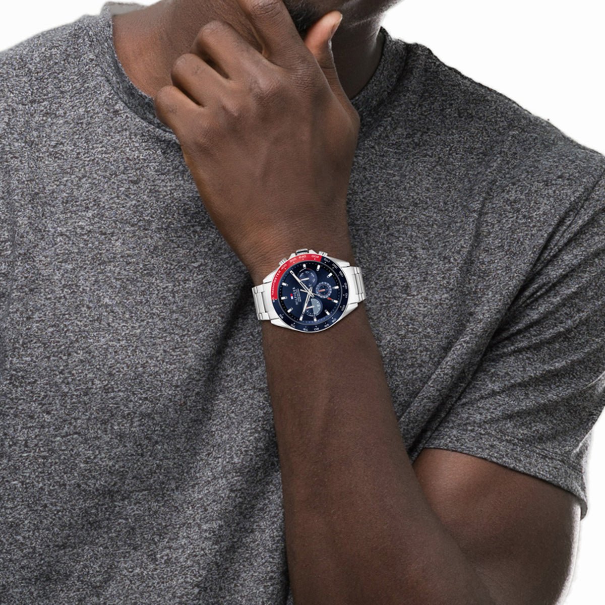 Men's Chronograph Watch From the Owen Collection By Tommy Hilfiger. Chronograph Watch With Round Case Of Size 46Mm Of Silver Color Made Of Silver Steel. The dial is blue. The glass is mineral. The strap is in silver-colored steel. Functions: Multifunction. The Resistance to Water is 5 Atm. The reference is 1791968.