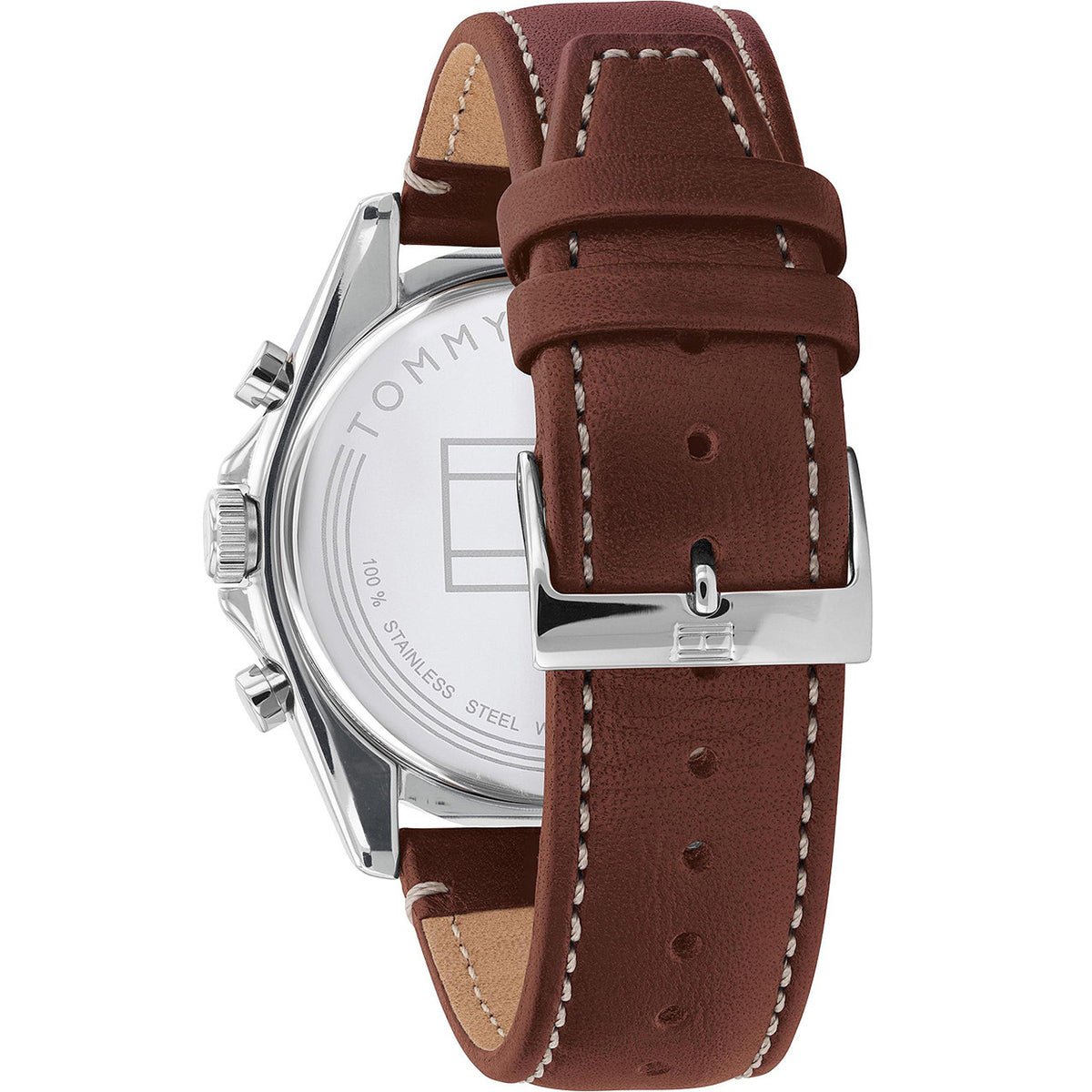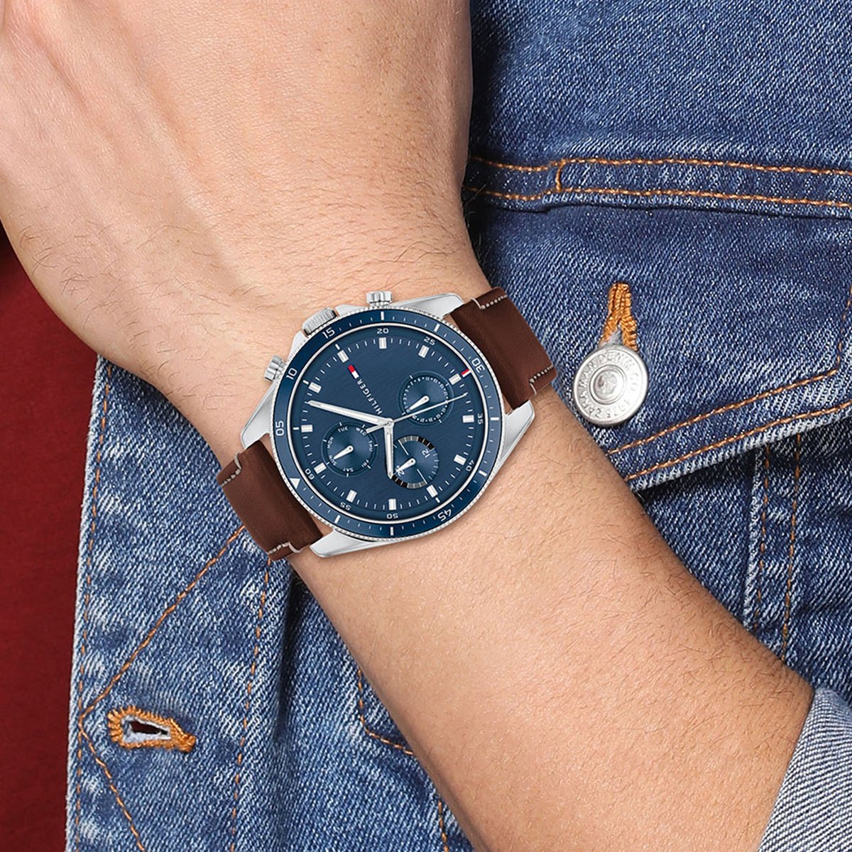 Tommy Hilfiger men's watch. Sophistication and perfect timing, all in one roust handsome timepiece set within a stainless steel case with a trio of sub-dials and brown, stitched leather strap. 44mm stainless steel case and brown leather strap, multifunction movement, sub-dials. Water resistant up to 50 meters.