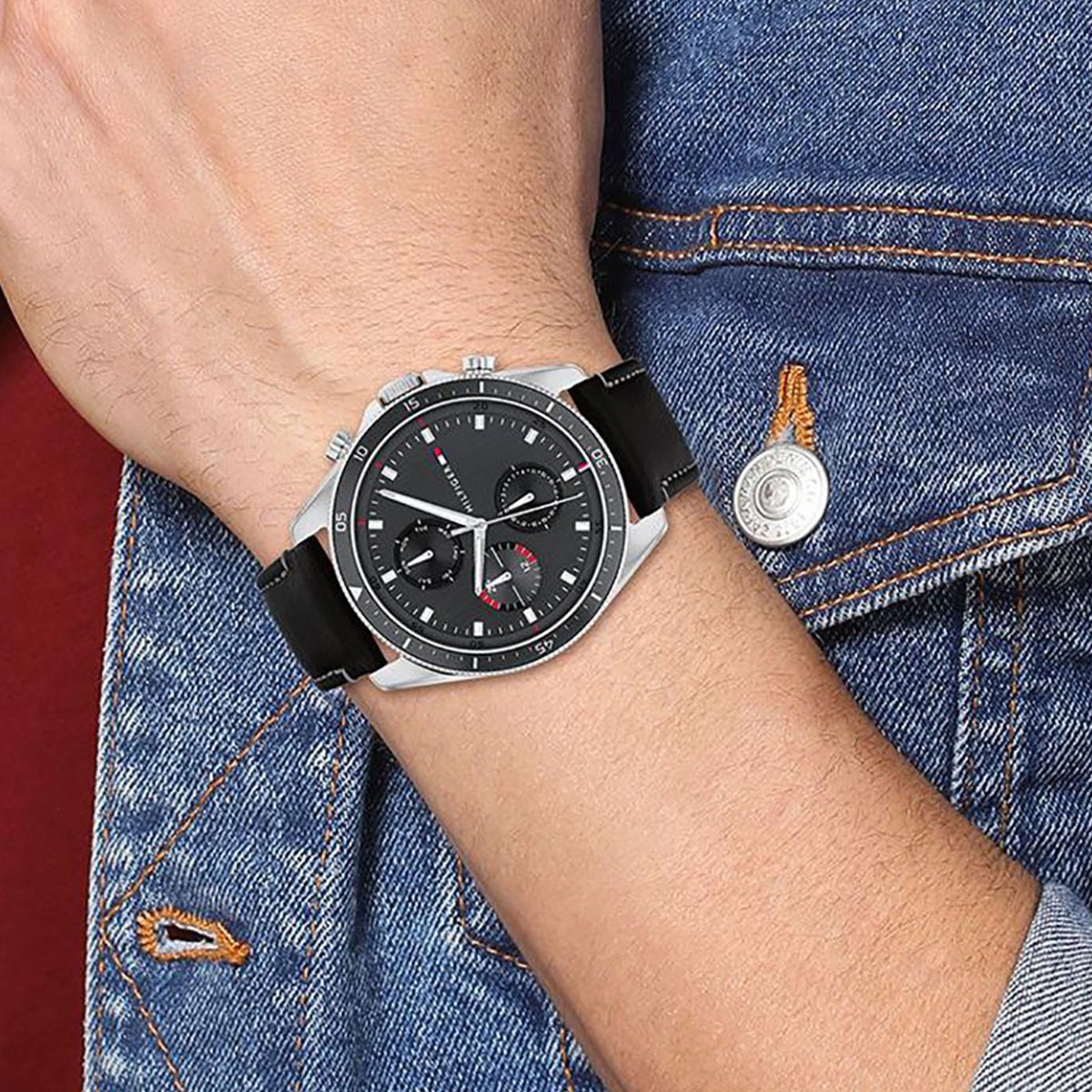 The Tommy Hilfiger Parker is a stylish men's watch with a 44mm wide and 8.4mm thick stainless steel case in silver. The bracelet in this model is a black leather bracelet with a width of 22mm from the attachment point. The watch features a multifunction and a diary.