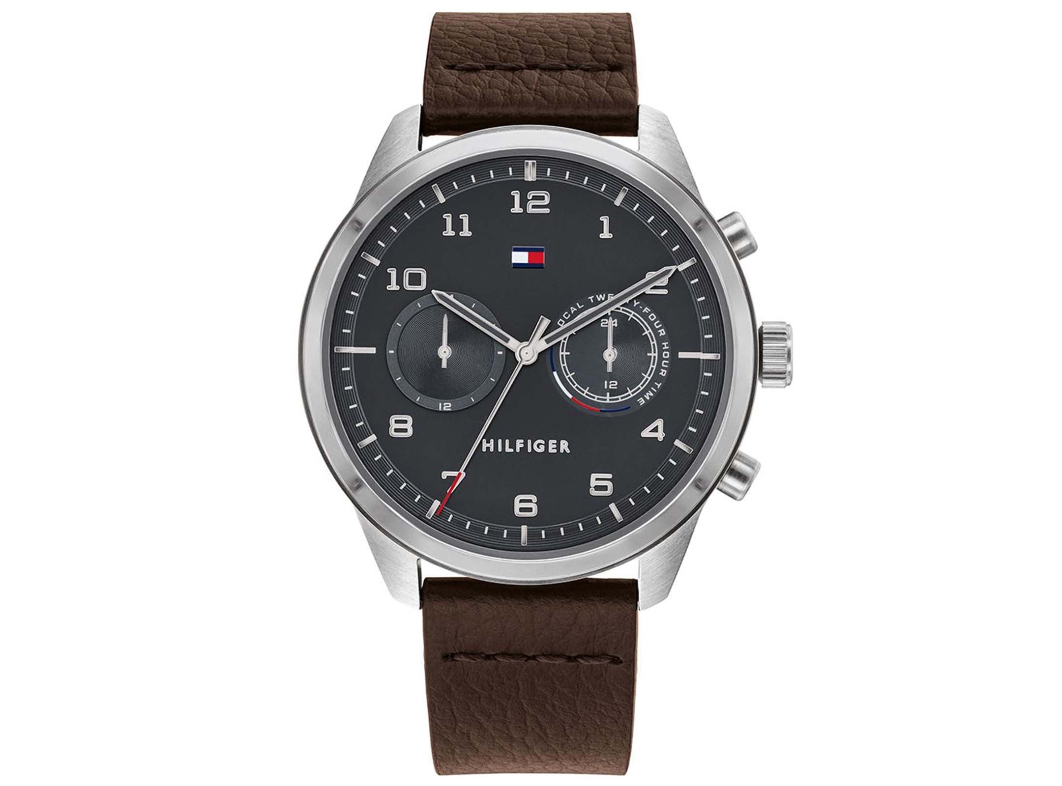 This fashionable and classic watch matches any outfit at any occasion,it adds style to your life -The watch has a function: 24-hour Display. High quality 21 cm length and 20 mm width Brown Leather strap with a Buckle. Case diameter: 44 mm,case thickness: 11 mm, case colour: Silver and dial colour: Grey. Water resistant: 5 bars-Weight: 68 g