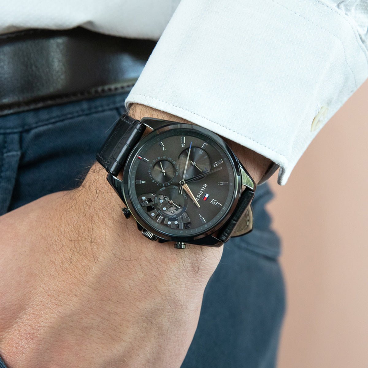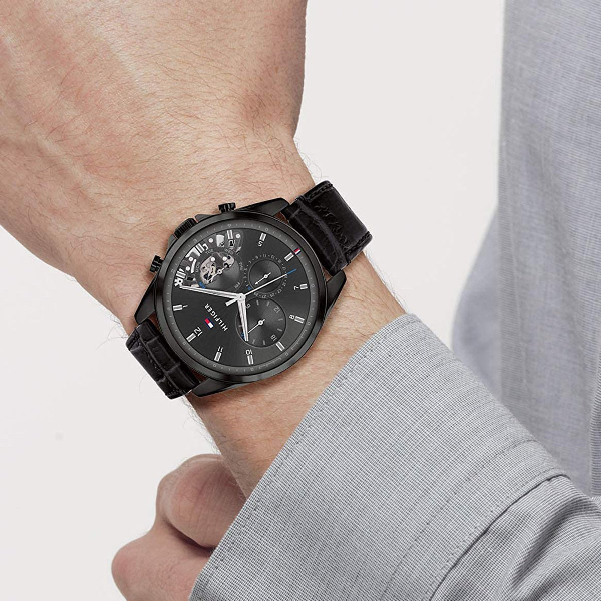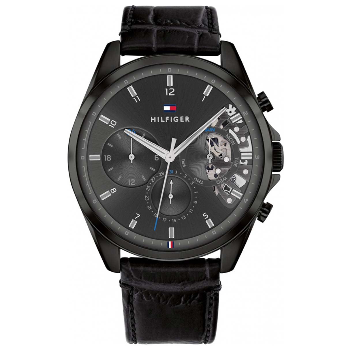 The Men'sTommy Hilfiger Watch 171.0452 is available to buy from Shade Station. It features a black leather strap, an ip black stainless steel case and has a black with three hand movement, sub dial day/date display dial.