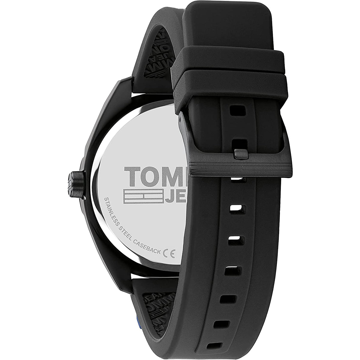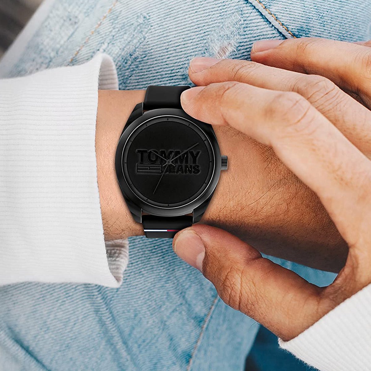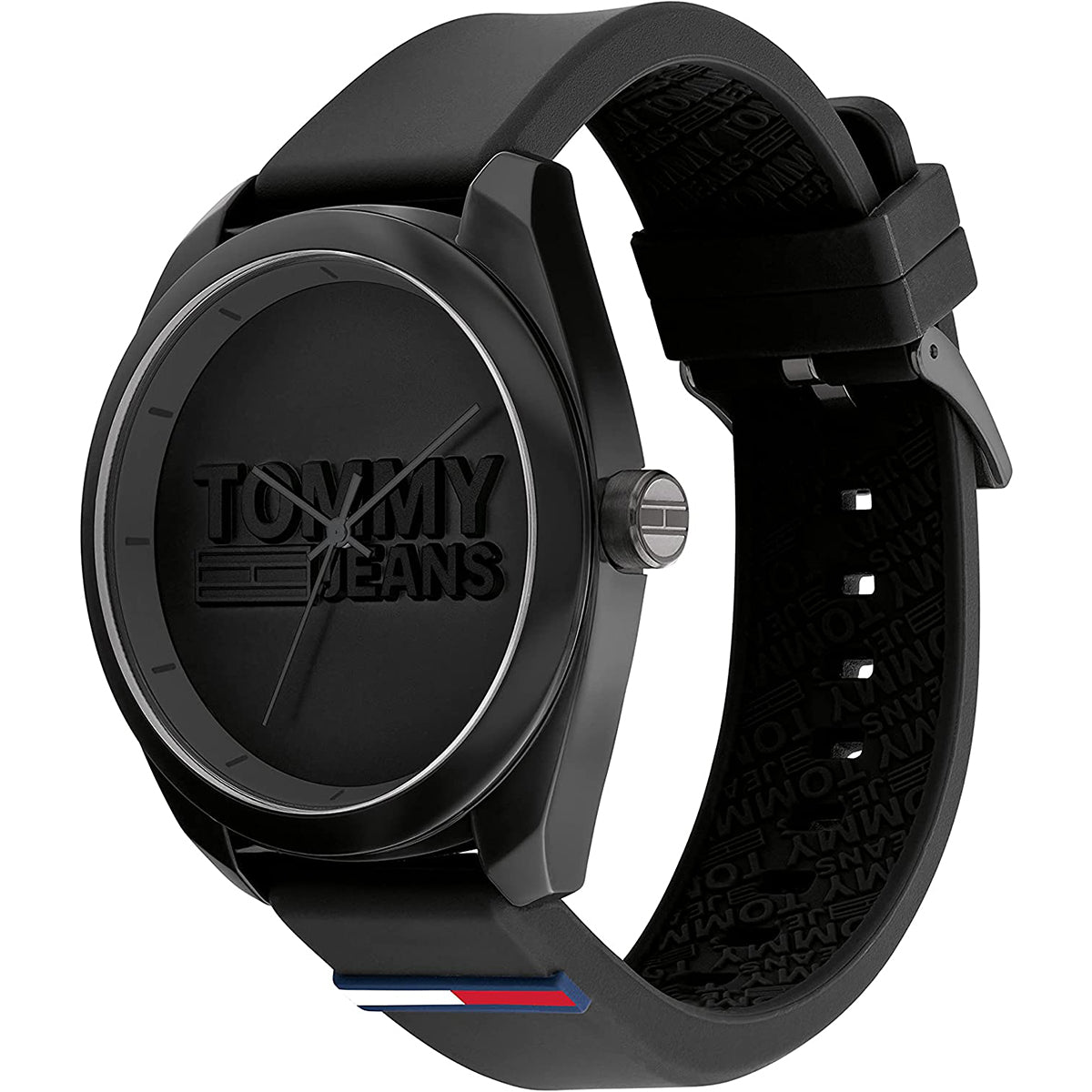 This sporty watch with a black strap and matching dial has a tough mineral crystal cover and features the Tommy Jeans logo.